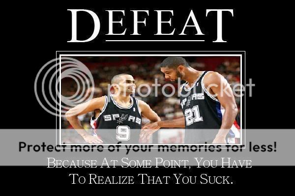 its cool that u guys are bonding and stuff but wouldnt it just be easier to just give up, because its obvious the Spurs already have. Parker will have to string together the 3 greatest games of his career in order for them to even have a chance. and Timmy's knee will literally burst spilling the blood and bone marrow all over the front row if this goes to a game 7.