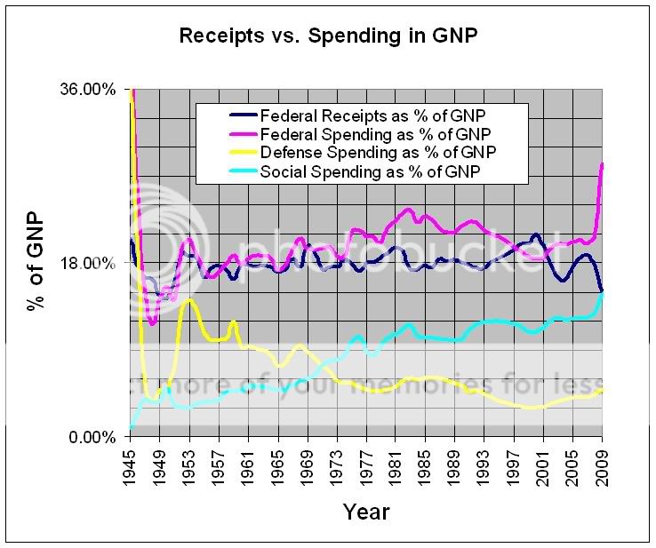 My intent was to show the out of control Social Spending. Notice that receipts correct at about an 18% average. Please note that the 2009 receipts are 15.1% of GNP and the Social Spending is 14.7%. I extrapolated the data from the following: