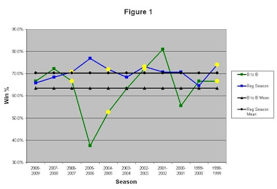 I see a dip there for a couple of years, and an excellent record for the other years. I'd guess that the average age of the Spurs dropped significantly from last year to this year. So as large a non-factor as b2bs have been in the last ten years, I expect more of the same. Duncan came in last year in about as good a shape as I've ever seen, and he's had another full summer to rest and now has quite a bit of help. His minutes will be down, especially if Mahinmi and Blair show some ability to contribute quickly. I'd bet that he misses fewer starts than he missed last year (7) as a result.