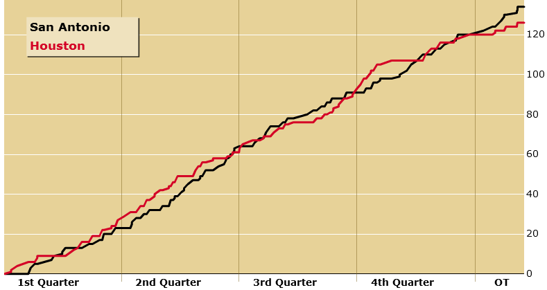 Fifty-three minutes later, we were again reminded why games aren’t played on paper. When the dust finally settled, the Spurs had escaped Houston with a 134-126 victory. The win is San Antonio’s fifth straight and their tenth in their last 11 games.