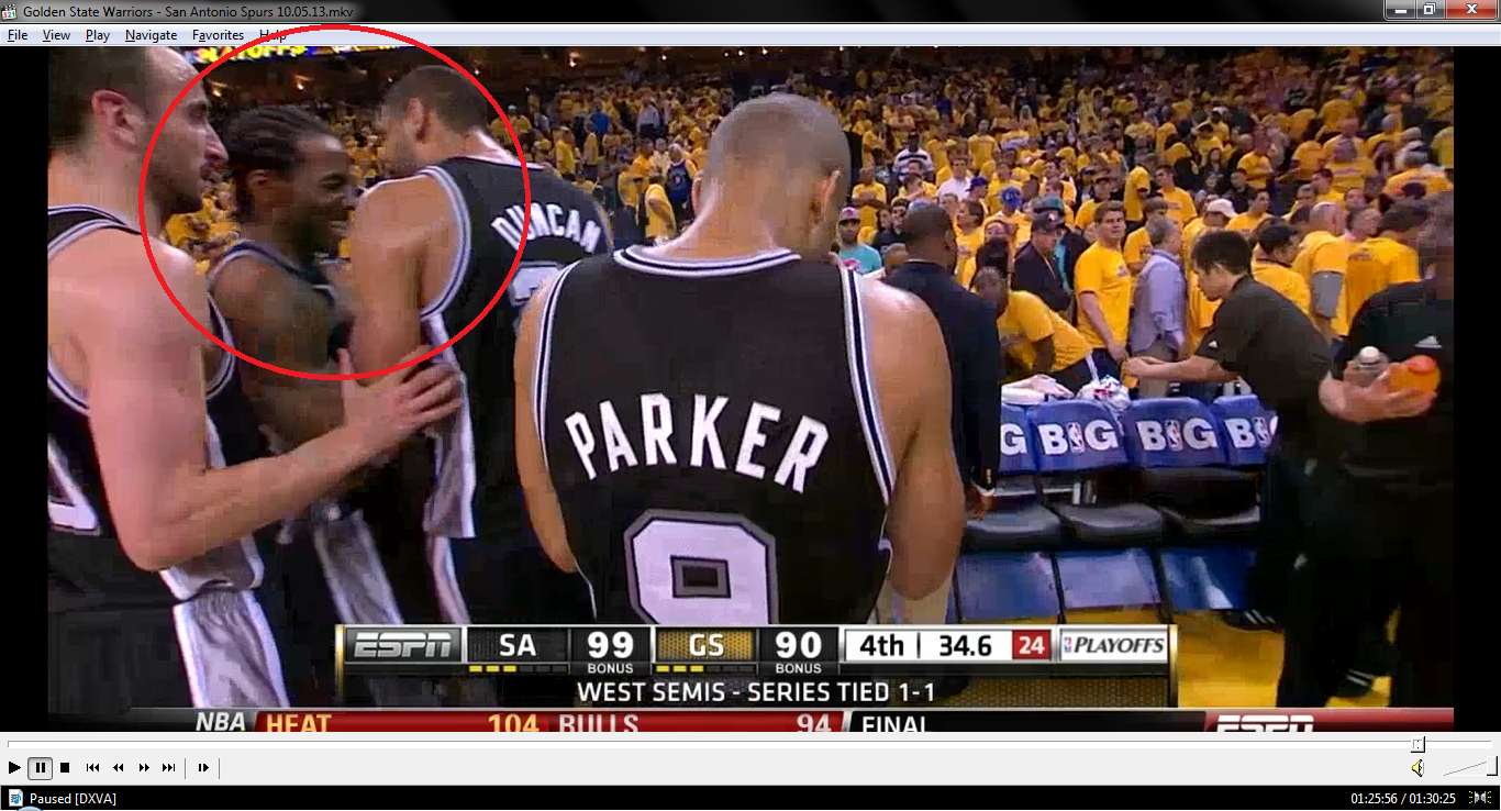 The one where Tim is leaning down at halfcourt, I'm pretty sure he's chewing chewing him out a bit. This is right after kawhi and Manu were 2v2 fastbreaking and kawhi didn't give it up. Duncan chewed him out in the regular season not too long ago because kawhi faked a behind the back pass to Tim and then got fouled or missed on a fastbreak. Tim just reminding him of what to do there. Good stuff.