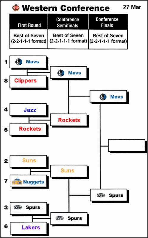 Here’s my prediction of this bracket, if it turned out this way by the start of the playoffs, my predictions are of how this bracket is played out on the image. So I picked Utah winning the first round, but the poster of this image didn't....so in second round since Houston is there, I picked Dallas 4-0 over Houston.