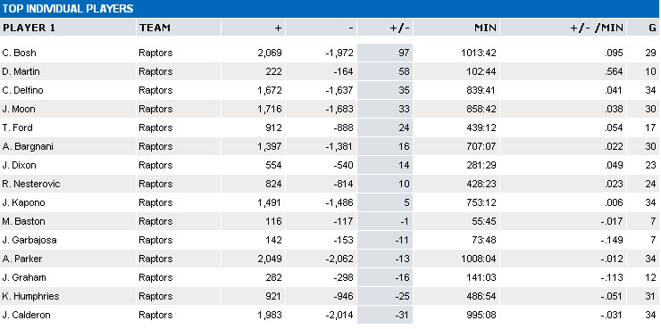 And guess who is the best plus/minus wise for the Raptors when Calderon starts ... yep, the second and third string point guards (Dixon and Martin).