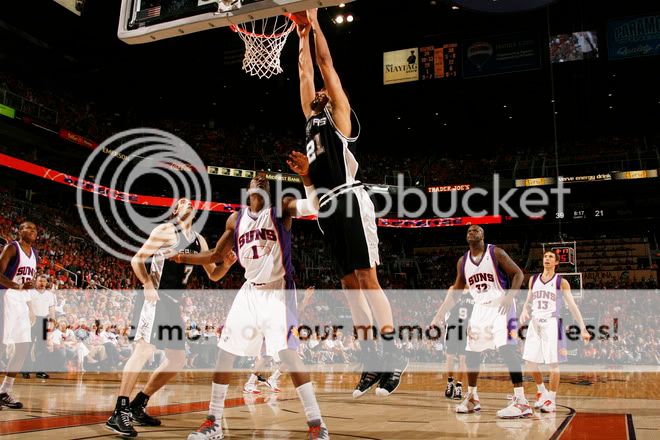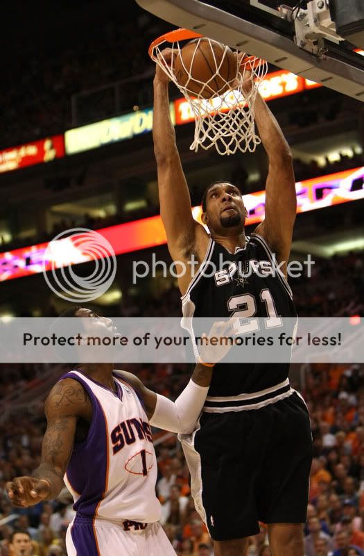 Unfortunately, there are probably hundreds of photos of Amare dunking on Tim. Keeping it real.